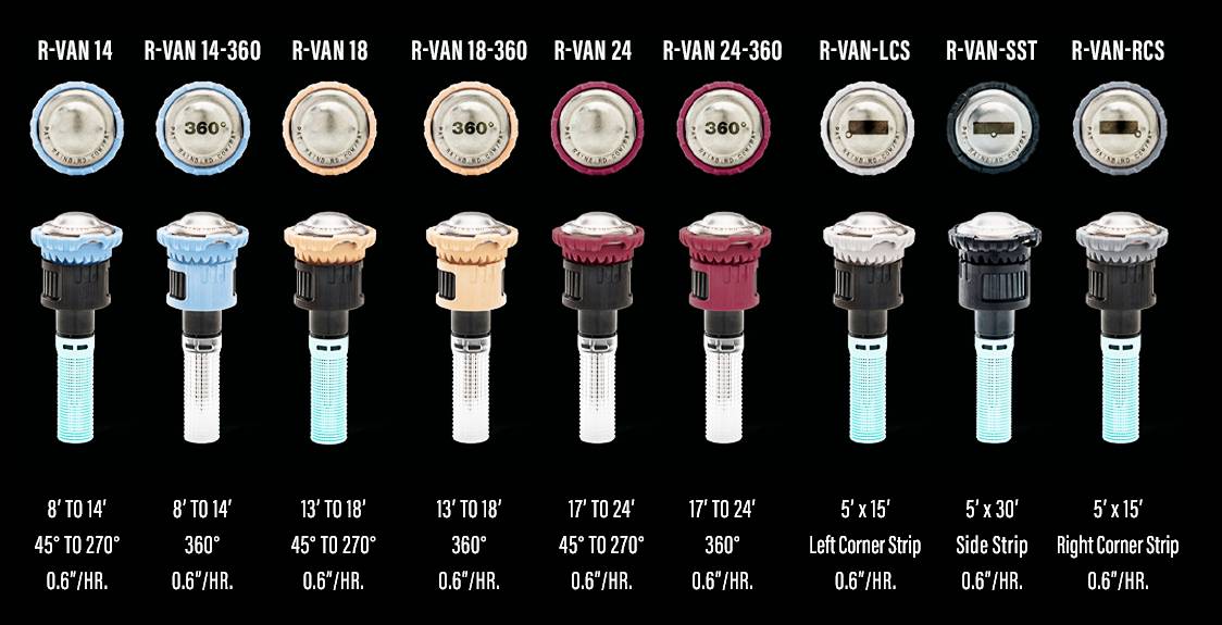 Regulowana dysza rotacyjna Rain Bird R-VAN 24 zapewnia oszczędność wody i elastyczność w projektowaniu. Wykorzystuje technologię obrotowego strumienia, która zapewnia równomierne zraszanie z niską intensywnością opadu, znacznie redukując spływ wody i erozję gleby.