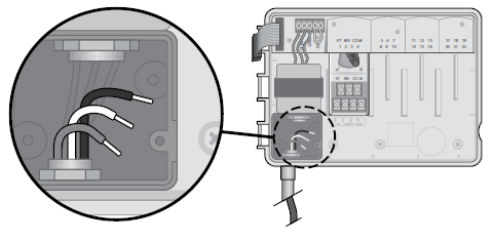 PRZESTROGA: Nie należy prowadzić przewodów czujnika deszczu przez ten sam otwór co przewody zasilania.