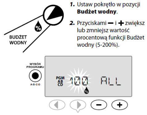 • Funkcja Budżet wodny umożliwia szybkie zwiększenie lub zmniejszenie czasu nawadniania w zależności od sezonowych warunków pogodowych. Ustawienie można zastosować do określonego programu lub WSZYSTKICH programów. Zakres regulacji wynosi od 5% do 200%.