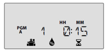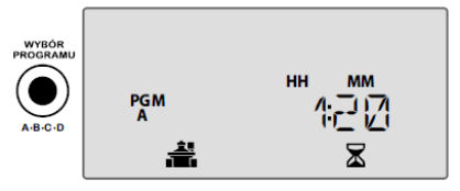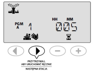 Podczas nawadniania wyświetlany jest migotający symbol zraszacza, numer aktywnej stacji i pozostały dla tej stacji czas działania.