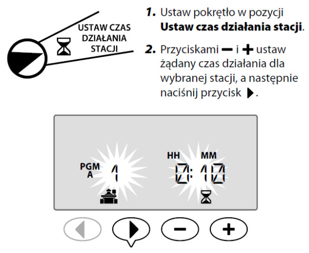 Czas działania stacji to czas (na przykład 20 minut), przez jaki stacja wykonuje nawadnianie. Czas działania może mieć długość od 1 minuty do maksymalnie 6 godzin.