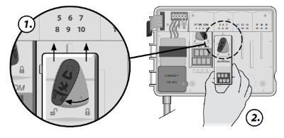 Panel przedni można zdjąć ze sterownika i zaprogramować zdalnie przy użyciu baterii 9 V, która zapewnia zasilanie. Można zaprogramować ustawienia dla wszystkich 22 stacji niezależnie od tego, które moduły stacji są zainstalowane w sterowniku.