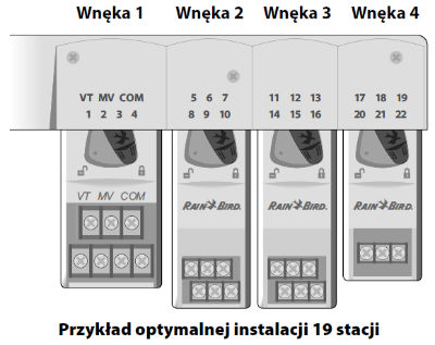 Podłącz przewody zaworów każdej stacji oraz (opcjonalnie) zaworu głównego, przekaźnika uruchamiania pompy lub czujnika deszczu.
