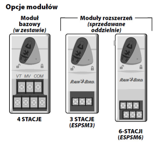 Sterownik ESP-Me jest standardowo dostarczany z bazowym bazowy, który obsługuje cztery stacje. Jeśli wymaganych jest więcej stacji, można zainstalować do trzech dodatkowych modułów stacji (brak w zestawie).