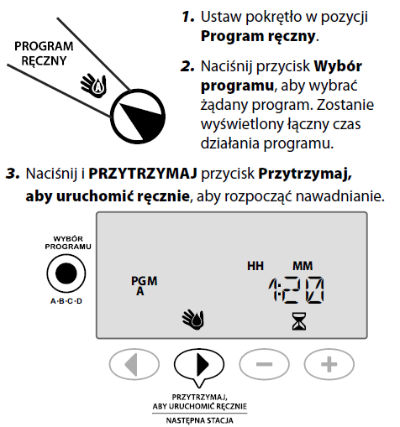 • Ręczne ustawianie stacji lub programu umożliwia natychmiastowe rozpoczęcie nawadniania przy użyciu pojedynczej stacji lub całego programu.