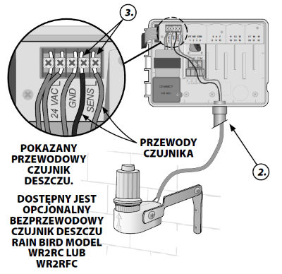 Podłączanie opcjonalnego czujnika deszczu (przewodowego lub bezprzewodowego)