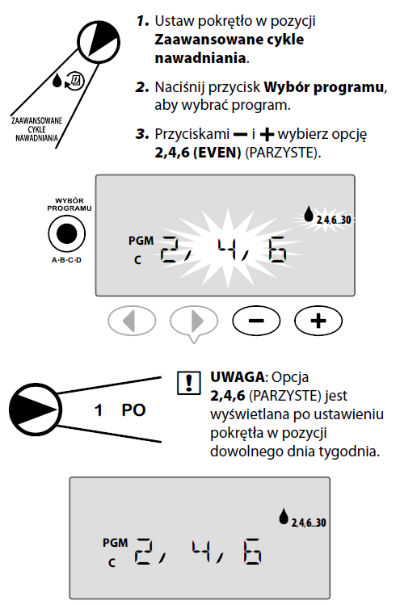 Ustawienie nawadniania we wszystkie dni PARZYSTE, na przykład 2, 4, 6...30.