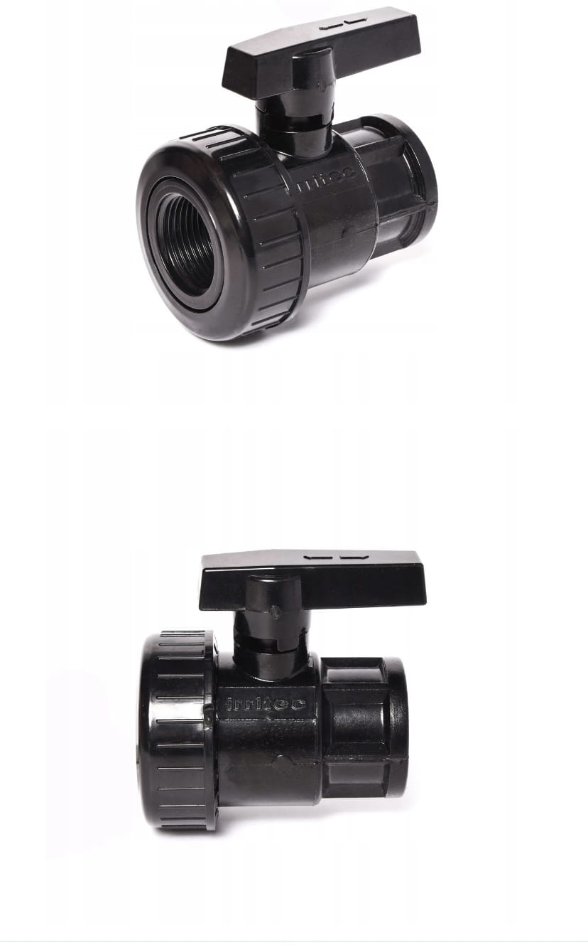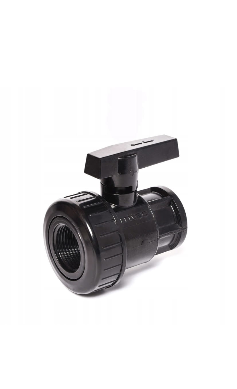 Zawór kulowy wykonany z polipropylenu odpornego na promieniowanie UV, uszczelnienia kuli wykonane z teflonu i gumy NBR.